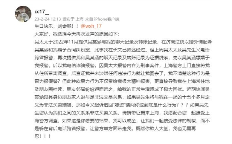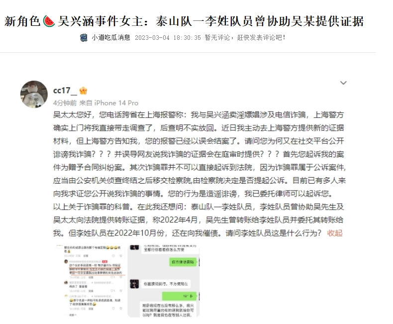 她在社媒实名曝光吴兴涵,透露吴兴涵欺骗感情、隐瞒已婚事实,用花言巧语PUA自己。还称吴兴涵骗钱,恋爱期间大大小小花费均由该女子买单,陪同吴兴涵买海参等补品时也是女方花钱。