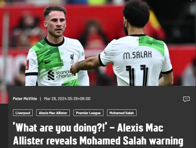 3月28日讯 利物浦中场麦卡利斯特接受采访时讲述了一件趣事,他第一次穿着长裤参加红军的训练时,被萨拉赫“教训”了。