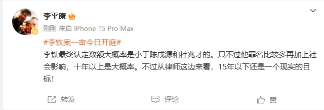 李平康写道:李铁最终认定数额大概率是小于陈戌源和杜兆才的。只不过他罪名比较多再加上社会影响,十年以上是大概率。不过从律师这边来看,15年以下还是一个现实的目标!
