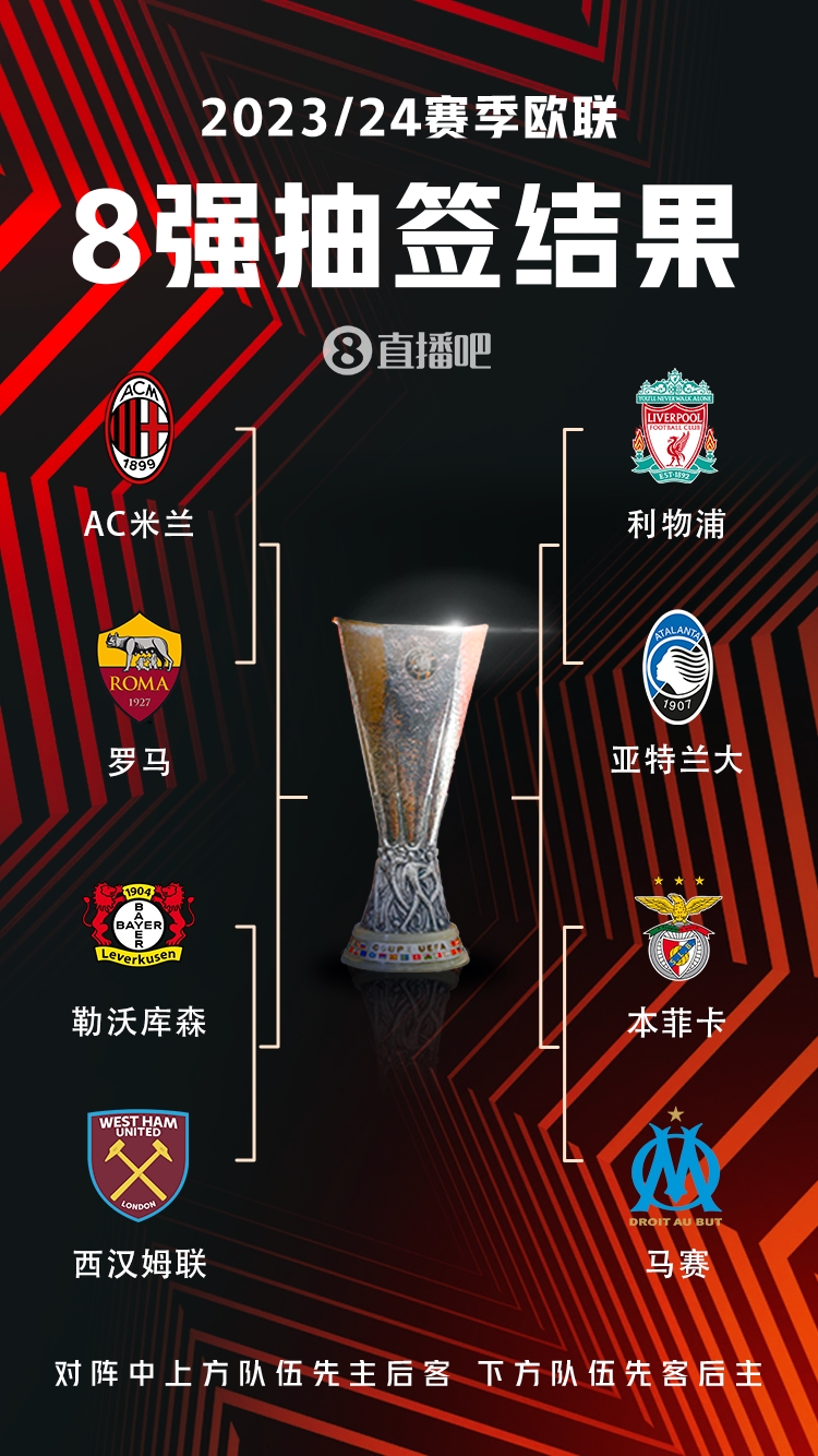 3月15日讯 北京时间20点,本赛季欧联杯1/4决赛抽签举行,同时半决赛对阵和决赛的主队方也同时抽出。最终结果出炉:利物浦vs亚特兰大,本菲卡vs马赛;AC米兰vs罗马,勒沃库森vs西汉姆联!