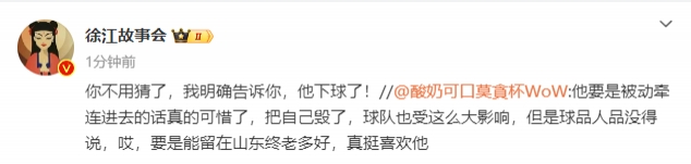 球迷:他要是被动牵连进去的话真的可惜了,把自己毁了,球队也受这么大影响,但是球品人品没得说,哎,要是能留在山东终老多好,真挺喜欢他