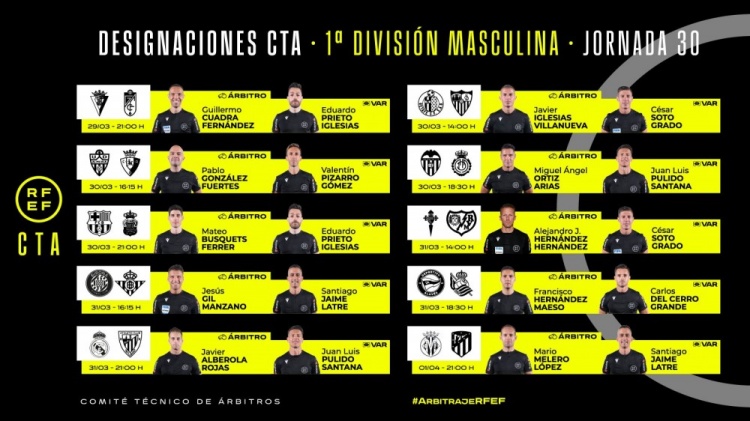 主裁判:赫苏斯-吉尔-曼萨诺;VAR裁判:圣地亚哥-海梅-拉特雷