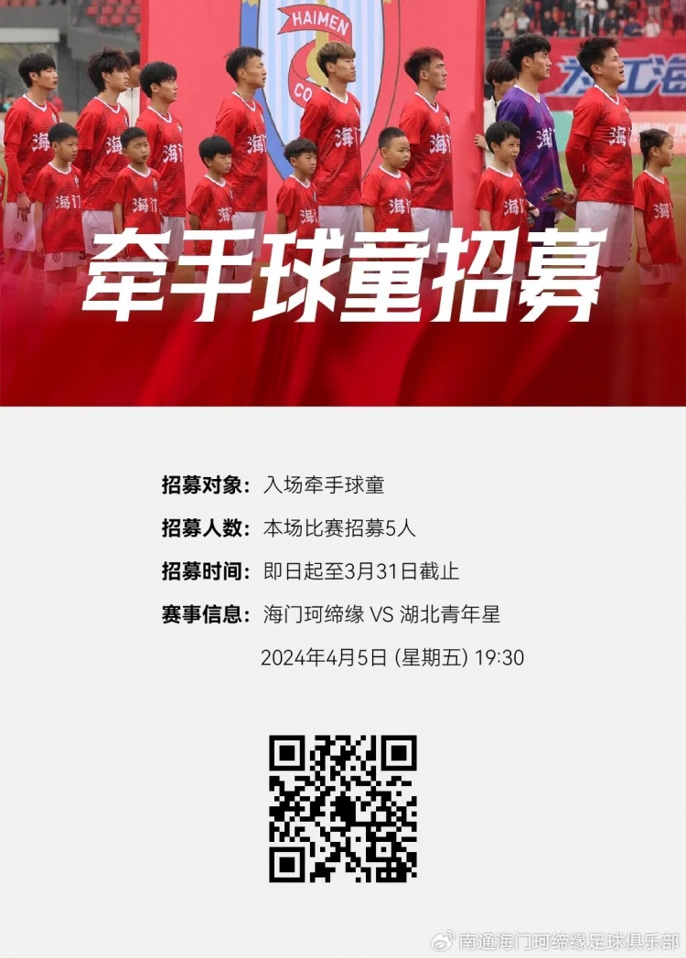 与海门职业球员牵手,一起步入我们的主场,让孩子度过了一次难忘的“牵手之旅”。现根据中乙联赛牵手球童相关要求,对2024年4月5日中乙级联赛预赛阶段第三轮海门珂缔缘vs湖北青年星的比赛进行牵手球童报名招募,具体详情如下:
