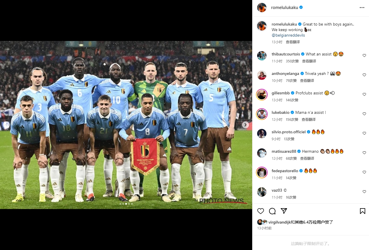 卢卡库在社交媒体上晒出比利时首发球员的合照,并写道:“很高兴再次与兄弟们并肩作战,让我们继续努力。”