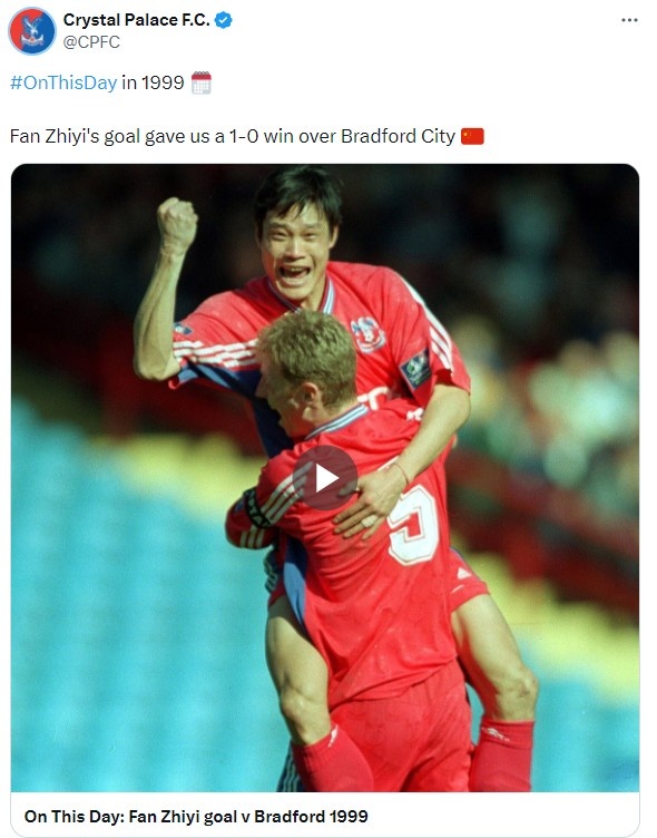 3月28日讯 今日,水晶宫官推更新,晒出25年前的今日“范大将军”用自己标志性的大力远射破门,助球队1-0击败布莱德福德的场景。