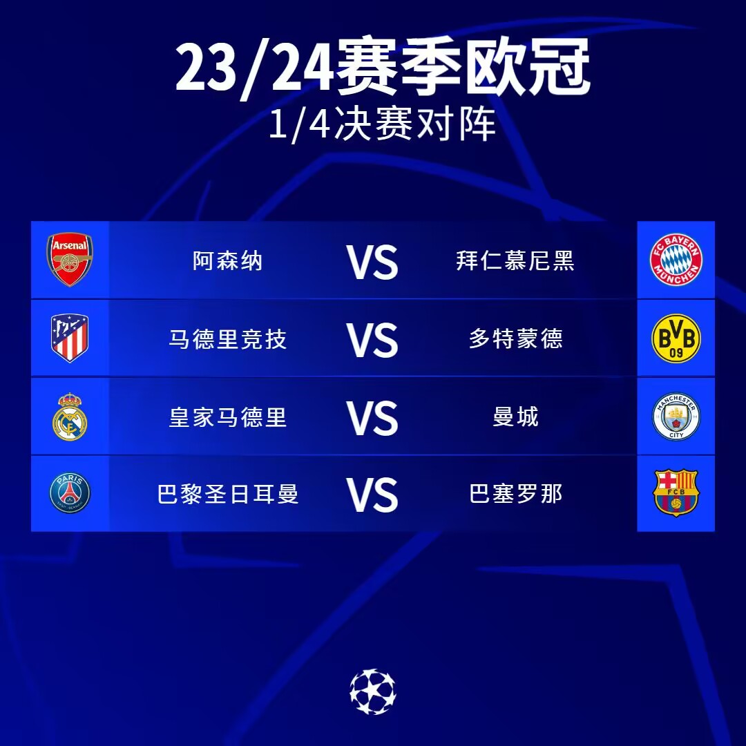 3月15日讯 本赛季欧冠8强抽签出炉,强强对话拉满,豪门云集。吧友们看好谁晋级4强?来投票给出你的预测↓