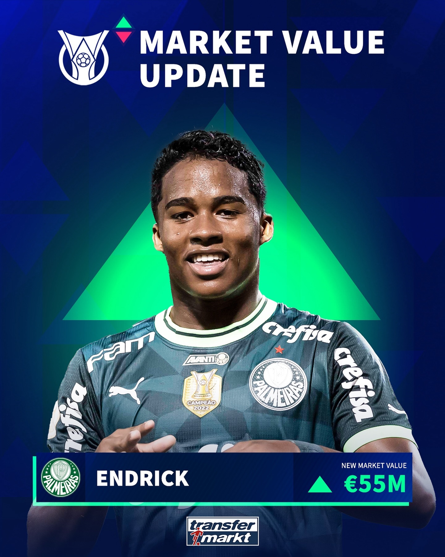03月28日讯 德国转会市场更新巴甲球员身价,帕尔梅拉斯17岁前锋恩德里克身价涨至5500万欧元。
