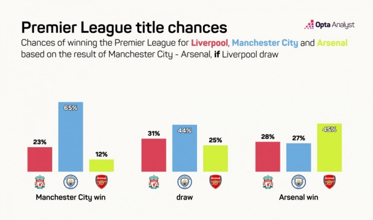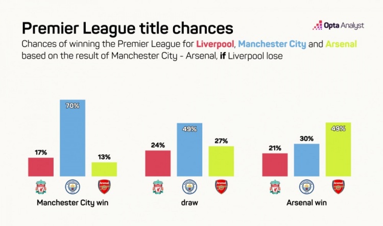 3月29日讯 英超本周将迎来曼城vs阿森纳的焦点之战,利物浦也将对阵布莱顿。《TA》通过大数据分析了不同赛果后的夺冠概率情况: