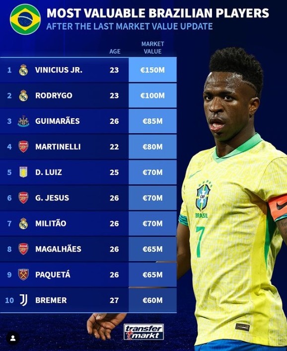 3月29日讯 《转会市场》更新了巴西球员身价榜,维尼修斯继续领跑,内马尔则未进入前十。