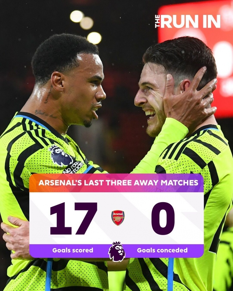 在近3场英超客场比赛中,阿森纳三战全胜,狂轰17球且一球未失↓