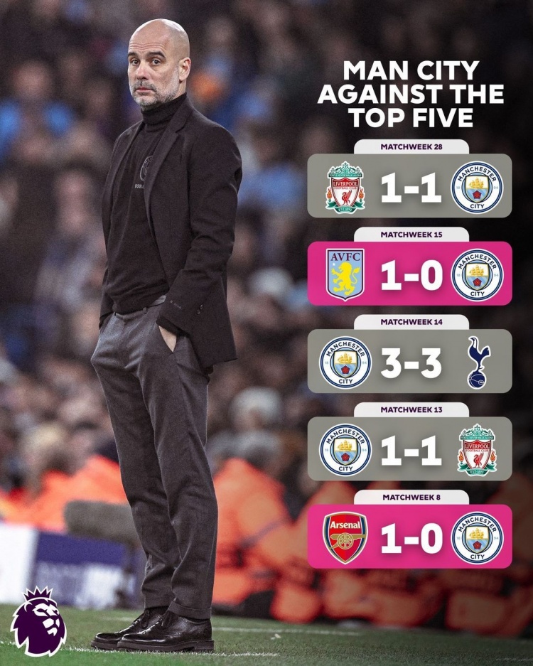 3月29日讯 本周日晚23:30,曼城将在英超中对阵阿森纳,迎来又一场争冠关键战。不过,在对阵目前联赛排名前5的球队时,曼城的战绩并不理想。