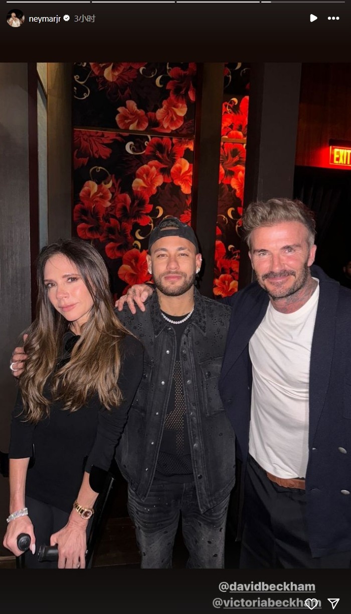 而今天,内马尔则晒出了自己与大卫-贝克汉姆以及维多利亚-贝克汉姆的合影。