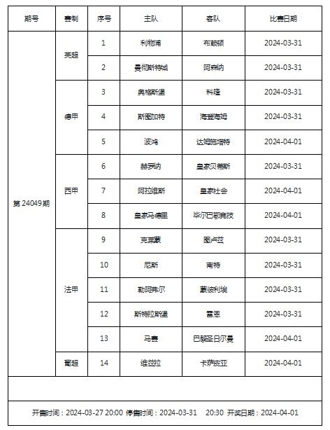 国际比赛日结束,各大联赛重燃战火。传统足彩第24049期的赛事主要由英超、德甲、西甲、法甲和葡超组成。利物浦、曼城、皇家马德里和巴黎圣日尔曼等强队也入选了本期足彩。