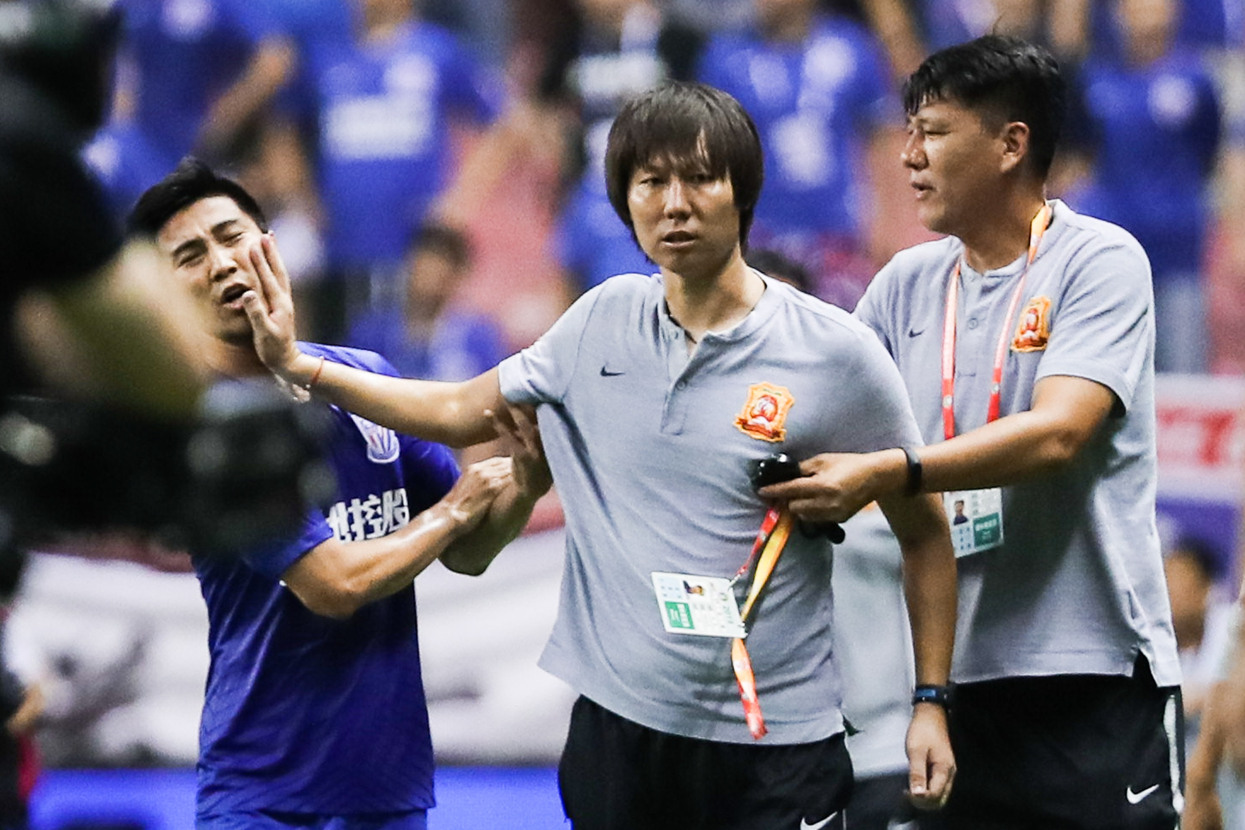 有一次在虹口,申花主场对武汉卓尔,比分是2比2,过程比较激烈,李铁很有情绪,比赛结束后很生气朝我们教练席走过来。我们队的球员孙世林要去拦他,他是想去劝李铁来着,结果被李铁一巴掌推倒。赛后发布会上,李铁还在赌气,说申花踢的足球不先进,花了很多钱但只打平了自己带的保级队。一般来说主教练很忌讳评价对方球队的表现,实在被记者问到也只是说一些不痛不痒的话,但李铁直接就骂申花了,所以大家有点傻眼。